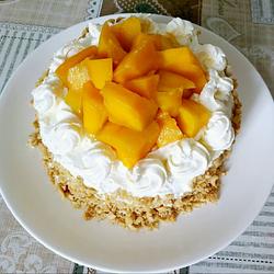 11.Cut the mango in the middle and add cream, spread cream on the edge and stick peanut essence on it, decorate it with your favorite flowers flowers and place sliced mango in the center of the cake.A simple chiffon cake is ready