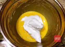 9.Pour one-third of the egg white into the egg yolk paste, mix up and down or stir evenly
