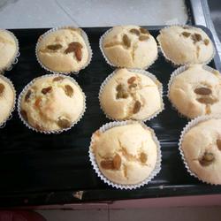 12.Pour into the mold and put a few raisins on top.This amount is for an eight-inch cake.I reached ten.Cup cakes are exactly the same size as a six-inch mold, and are baked in small ovens.For cup cakes, the time is 180 degrees and 20 minutes.For six-inch molds, the time is 150 degrees and 40 minutes.For 8-inch molds, the time is 150 degrees and 50 minutes.You can Control the temper of your home oven! The six-inch to eight-inch mold needs to be stun twice to exhaust when entering and exiting the furnace! Let the cup cool before eating.It will be soft when eaten hot, but it still tastes good!