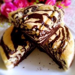 7. Use a spoon to stir a spoonful of egg yolk paste into a six-inch mold, and then use With another spoon, stir a spoonful of cocoa powder paste and pour it along the center of the egg yolk paste.The new paste will push away the old paste.Repeat this process until all the batter is poured in.