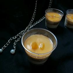 12. Heat about 150 grams of fresh orange with insulated water, and then put it in advance Soak half a sheet of gelatine (2.5g) in ice water until soft, mix well and cool to hand temperature.Take out the mousse cup and slowly pour orange juice with a spoon.The mirror is ready.
