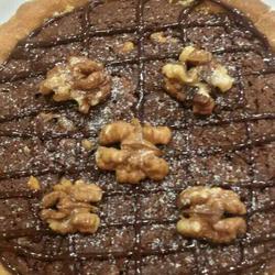 5.Put the baked tart into the refrigerator and refrigerate it.Come out and decorate with chocolate sauce and walnuts on the surface.