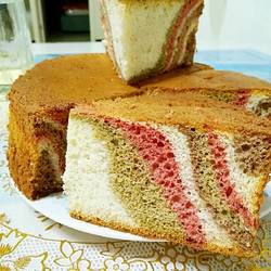 16. Take an eight-inch cake mold, pour cocoa, original flavor, red yeast rice, and matcha into the center of the mold in two batches, and put the original flavor in three batches.Layer the original flavor, as shown in the picture