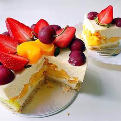 4. Pour the mixed digestive biscuits into a 6-inch plate and compact it to make the cake base, and put oddities on the edge Fruit and store in the refrigerator