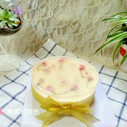 11.After the Sprite cools down.Take out the cheesecake and slowly pour the Sprite mirror liquid into it.Put the cherry blossoms in.Then refrigerate.