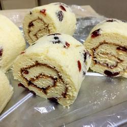 6.The side with oil paper (which is the bottom) should be beautiful and have vines Decorate with bilberries.After the cake is at a moderate temperature (do not let it cool), place the pretty side down (ugly side up) on the plastic wrap and spread cranberry sauce on the ugly side.Use seaweed roll method to roll the cake into strips.Seal the front and back and refrigerate for 1 hour to set.Then take out the slices and it’s OK.