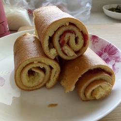 3.Pour it out from the oven, spread it with jam, roll it up with oil paper, shape it slightly, and cut it into pieces