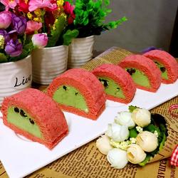 22. Pour the matcha mousse into the cake roll and sprinkle some honey beans