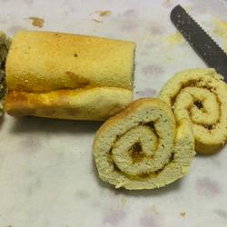 17. When it is flat, spread the bean paste filling on the cake and roll it up.