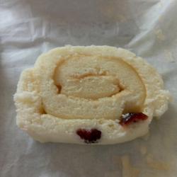 18.Then spread a light Use a rolling pin to roll up the condensed milk, and the dried cranberry cake roll is ready!