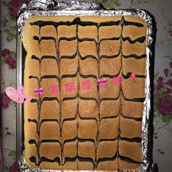 9.Put the cocoa powder liquid into a piping bag, squeeze out a long strip horizontally, use a toothpick to draw it along, and preheat the oven at 180 degrees for 5 minutes