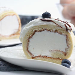 13. Spread the cream evenly on the surface of the cake embryo, and roll it from the bottom with a rolling pin Start and refrigerate for 1 hour to set.