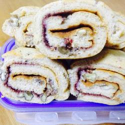 20. Spread condensed milk on the top and bottom of the cake, spread blueberry jam on the middle, and spread it from the bottom Roll up into a roll.