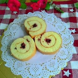 18. Roll the cake when it is still warm.Use a cake knife to lightly score a horizontal line without cutting into sections.Add homemade mulberry jam and slowly roll the cake with oil paper.