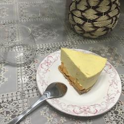 9. Take out the mold with a biscuit base from the refrigerator, put the remaining half of the mango pieces into the bottom of the mold, and then Put the mango cheese sauce into the mold