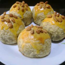 6.Install the oven tray, brush with egg yolk liquid, sprinkle with crab roe and pine nuts (sesame seeds are also available) OK)