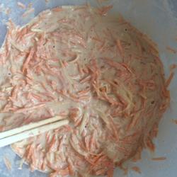 1. Peel and grate potatoes, grate carrots, two eggs (one or two are OK), add water (appropriate amount, not too thin), flour, salt, thirteen Fragrance, olive oil or peanut oil, you can also add sesame oil and stir