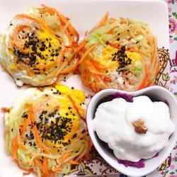 3. Heat the oil, put it into the electric baking pan and arrange it into the shape you like.I made it round⭕️.You can place it at will and leave one in the middle of the three wires.Small round shape ⭕️ Pour in an egg and sprinkle with a little mustard diced black sesame seeds.Wait for the cake to set, turn it over and serve on a plate.