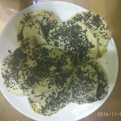 6. Brush the electric cake stall with oil and preheat it in advance.Put the rolled out flour cake into black sesame seeds and dip both sides with black sesame seeds, then place the black sesame cake in the electric pan and fry it on both sides.