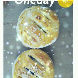 9. After all 10 pieces of dough are wrapped, flatten each one and brush with egg.liquid, make 3 cuts on the surface, be sure to score the upper layer of the dough, and sprinkle some sesame seeds