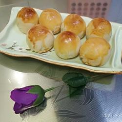 12. Roll out the proofed rolls into round cakes and wrap them with mung bean filling and egg yolk balls.