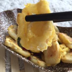 7.Continue to stir-fry until the rice cake slices are coated with eggs, and fry the rice cake slices until golden brown