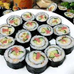 14. When spreading the seaweed over the rice, leave a little bit of seaweed at the end and do not cover it all over the rice, so that it can be rolled tightly without squeezing the rice.From the outside of the seaweed, if it is not sticky, you can use rice grains to glue the seaweed