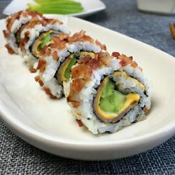 6. Evenly coat the rolled sushi roll with a layer of reserved bacon crumbs!