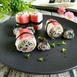 18. Roll up all the crab sticks in turn, and roll the remaining rice into a thinner roll with seaweed.Nori rolls.