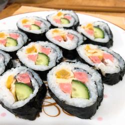 Rice ( A bowl ) | Ham sausage ( Half root ) | Salad dressing ( It depends on your mood ) | Sushi seaweed ( 1 piece ) |