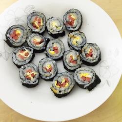 5.Put a piece of seaweed on the bamboo curtain, then spread the rice flat on the seaweed, and then cut it Put good ham, sausage and eggs on the rice, and then roll them