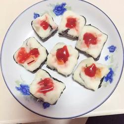 4.After spreading evenly, put the carrots and cucumbers cut into strips and roll them up