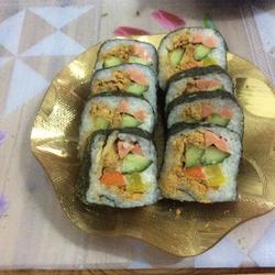 3.Remarks I did not put sushi vinegar in the sushi rice.The ratio of rice to glutinous rice is 2:1.A little glutinous rice.Lay the bamboo curtain flat and place the seaweed.Pay attention to the direction of the texture on the front and back of the seaweed.Lay the seaweed flat and put the rice on it.Evenly, put the four-piece set, that is, cucumbers, carrots, large roots, and square legs, then sprinkle with salad dressing, put on the meat floss, and finally start rolling.When the first roll is over, tighten the bamboo curtain on top, and then roll Roll it into a square shape, roll it back and forth a few times to finalize the shape?