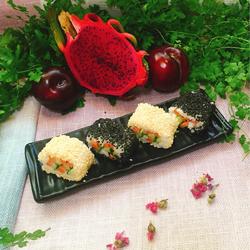 5. Season the rice with salt and MSG in advance, stir well and let cool.Arrange the rice as shown in the picture, and then add one sausage strip and one cucumber strip as shown in the picture