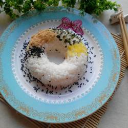 6. Chop the radish, seaweed, meat floss, and black sesame seeds respectively.Sprinkle on top of the rice ring and press lightly to avoid falling off.The sushi donuts do the trick.