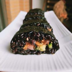 1.Take a piece of seaweed, spread it on the sushi mat, and then spread it with a layer of black rice