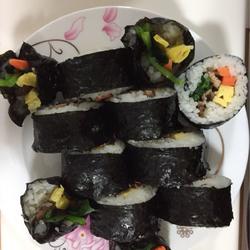 9.Put the mixed rice on top of the seaweed bought in the supermarket.Leave edges on three sides and cover the side closest to you.(Start rolling from this end) Add radish, eggs, pork, and spinach in sequence
