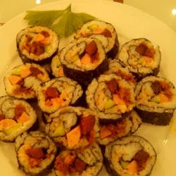 3.Place the steamed rice on the sushi seaweed (not too thick)