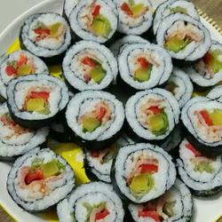 4.Put the rice on the sushi curtain, add the ingredients one by one, and squeeze on the tomato sauce