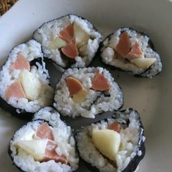 4. Spread the rice evenly, then put the things to be sandwiched, and then sprinkle with salad dressing It's time to roll sushi.After rolling it, just cut it into small pieces