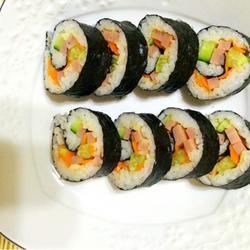 2. Lay out the curtain, spread the seaweed sheets, and spread an appropriate amount of rice evenly (not too much, Otherwise, it will be very thick when rolled up), and arrange other ingredients evenly (be careful to leave the edges of the seaweed slices, do not cover them all)