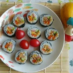 1. Mix rice with sushi vinegar and sesame oil.Cut various ingredients into strips and set aside.In order to taste good, the rice is steamed with rice and glutinous rice.