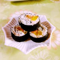 1. Stir the steamed pearl rice directly in the container, pour sushi vinegar, and stir evenly , cut ham into strips, cut cucumber into strips, and radish strips are ready-made and taste very good