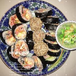 8. Spread a piece of seaweed on the bead curtain, then put on disposable gloves and spread the mixed rice evenly on the seaweed, leaving some room at the end for the rolled sushi to stick to.