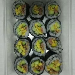 10. Cut the rolled sushi into sections and serve on a plate.It tastes even better if you sprinkle some tomato sauce on it!