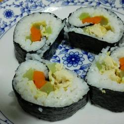 4. Everything is ready.Spread out the mat, put a piece of seaweed on it, and then spread the rice on it, not too much.Then put the four materials at the forefront.Finally roll it up with the help of a mat and make it into the shape you like.Remember to compact.