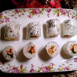 8.Put the black sesame seeds on top of the plastic wrap, put the rice on top, and Add chicken tenders and green onions.