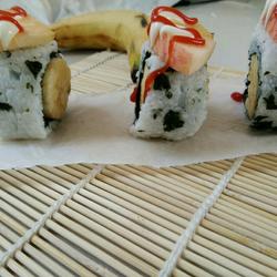 4. If you like, you can evenly squeeze the salad dressing on the seaweed, but I don’t like it, so I Didn’t let it go.Add bananas and squeeze on tomato sauce.