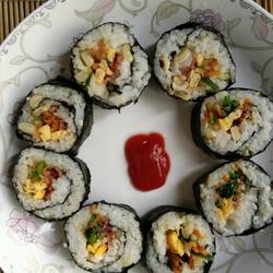5.The laid rice and vegetables are slowly rolled up with a seaweed board and tightly closed with a rolling curtain one time.