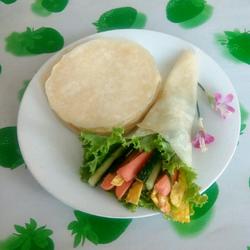 8. Place the lettuce on the cake, spread it with spicy sauce, and add the green onion and coriander., finally add egg pancake strips, cucumber strips and ham strips and roll them up.